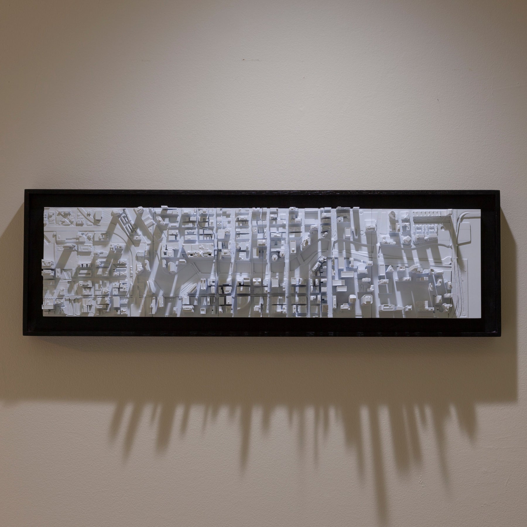 Framed group of four Microscape Chicago models hung on the wall. The models capture the main branch of the Chicago River from Wolf Point to Lake Michigan and many important landmarks along the way.