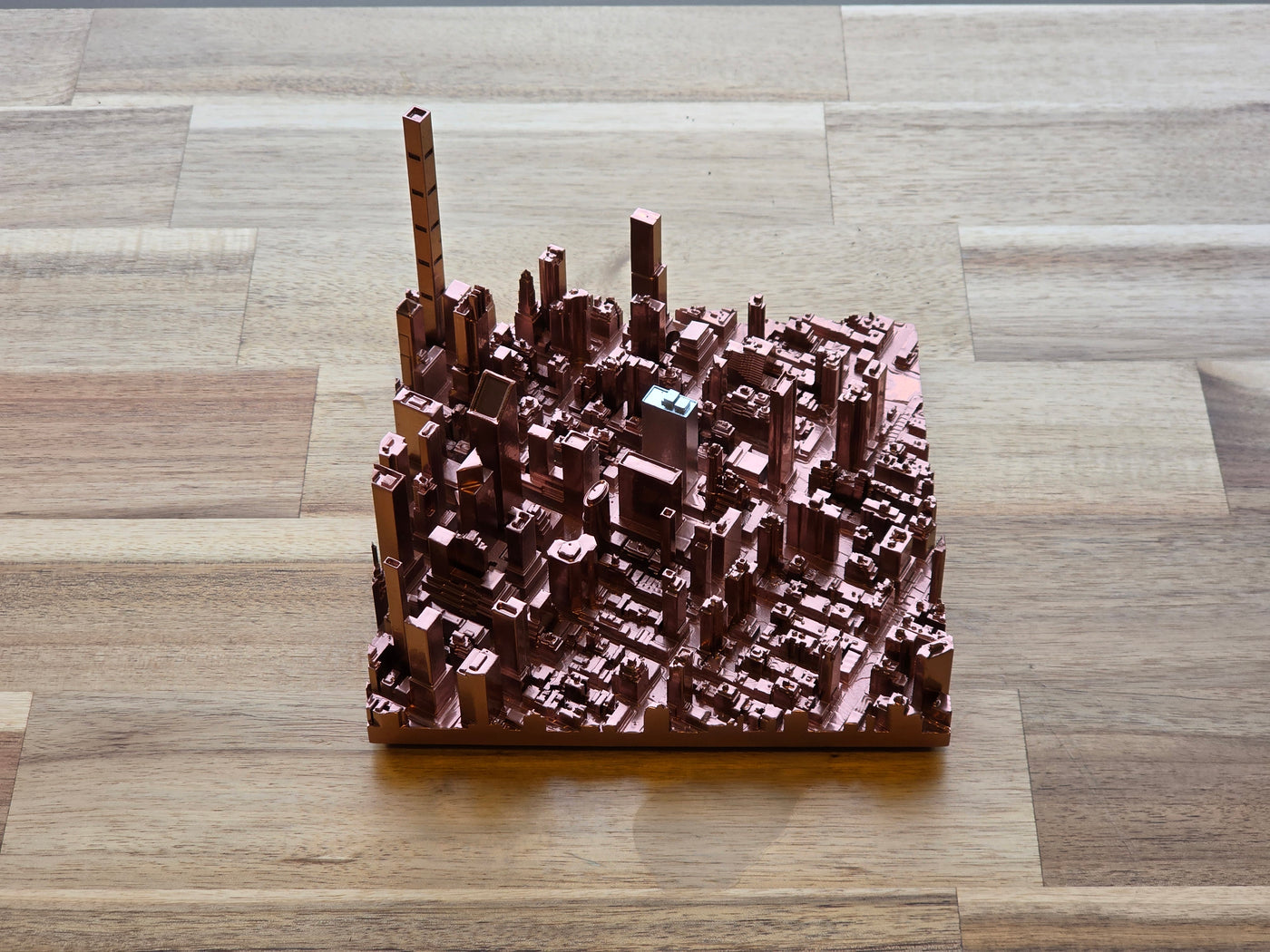 Commemorating the opening of Madison Square Garden Entertainment's Sphere theater in Las Vegas, this piece brings together MSGE's five landmark entertainment venues in a single, sculptural object. The simple rectangular block is split into five equal sections, with the copper plated venues arranged in chronological order, centered in each section and surrounded by a little bit of their context. 200 were produced.
